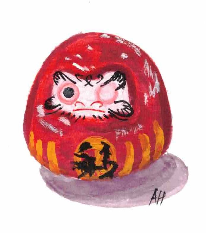 Water based gouche on watercolor paper. Still life painting of a daruma doll.